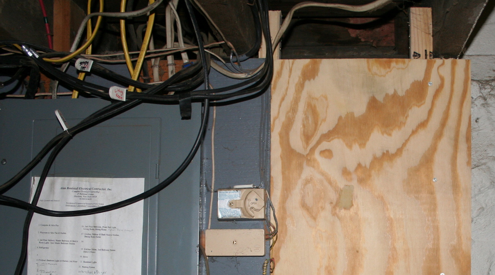 The solution - put up a coax panel. Very similar to the power curcuit braker. I get to 2x4s to hold the board. If I put them up the same way as the power board is ... I couldn't slip the ply wood behind the power ply wood. So I have to turn them ... and cut out a 'tongue' so that I can nail the two supports up.