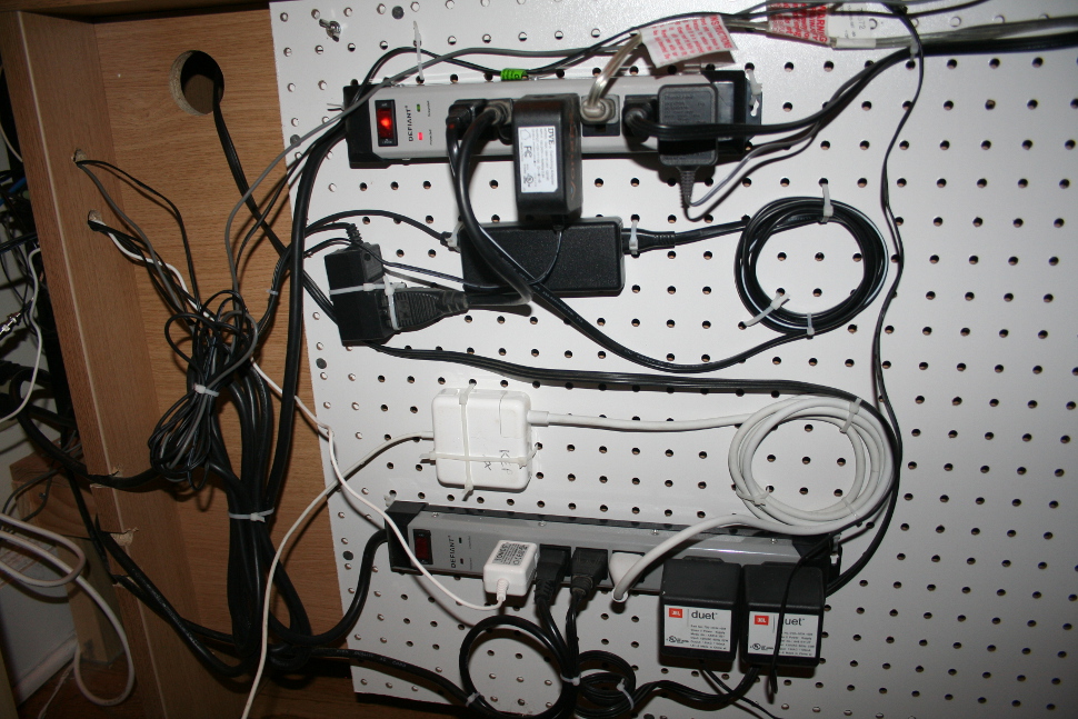 The rats nest of cables running from her laptop, my desktop, modem, wireless router, phone charger(S), various desk lamps, etc was turning into a nightmare. It was worse because our two dogs (Irish Red & White setters) left dust bunnies like you would not believe. These bunnies loved hiding in the nest of cables.
