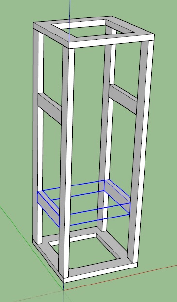 Here is the view of just the 2x4 (actually, 1.5 x 3.5). The bottom (blue) side supports could also be slotted angles. I will be keeping the top side supports for stability and also for patch panel support.