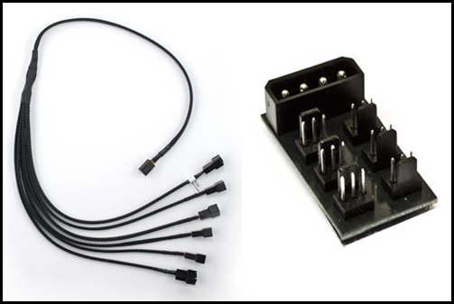 That is a Phobya 3-Pin x 6 Fan Cable Splitter on the left and a Phobya 4-Pin to 6 x 3-Pin Fan Splitter PCB on the right.