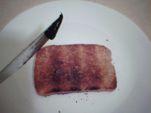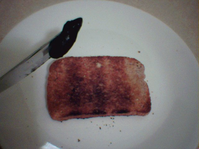 Butter the toast, right to the edges. Now, get some vegemite on your knife. Not too much. No, that is way too much - put some back! Remember this isn't like jam. The following picture shows a knife with too much vegemite on it.