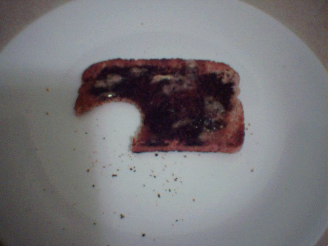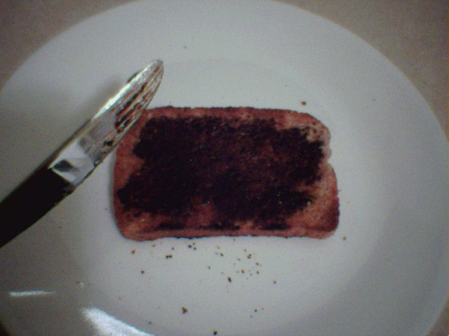 The picture below shows a much better amount of vegemite. Now spread it thinly (THINLY) over the toast, again, right to the edges.