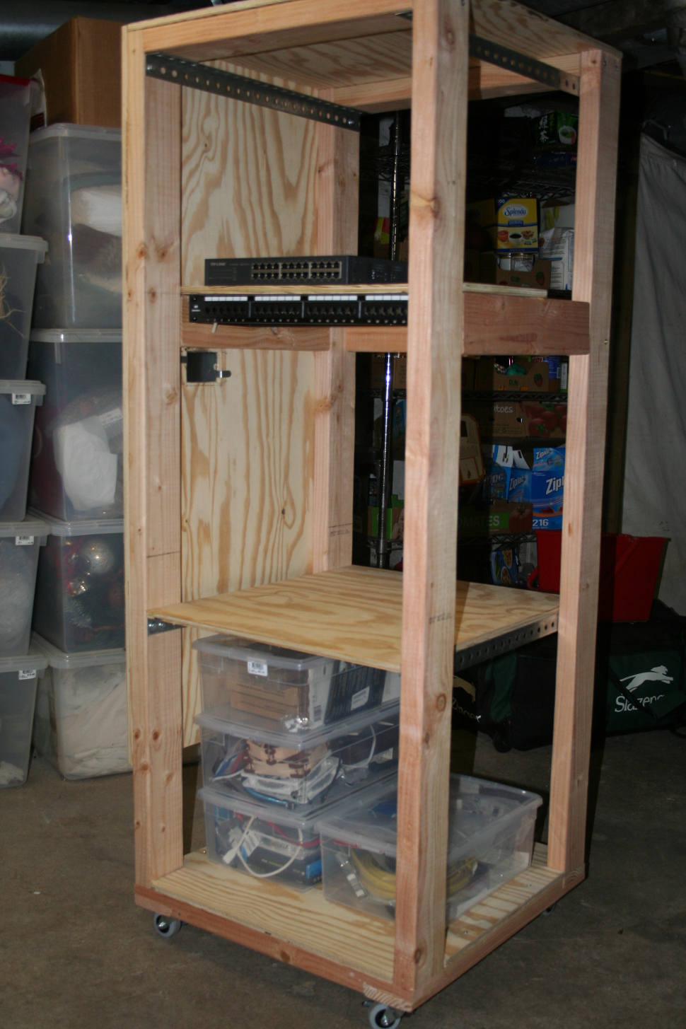 The planned 2 x 3 plastic container storage on the bottom fitted perfectly (way to go sketchup!). The middle shelf with the yet to be purchased, built, o/s loaded, etc NAS looks good. I will be putting in a Fractal Design Define R5 in there. The top shelf has a 24-port patch panel on the bottom, a 24-port switch on the top and room for other power items (cable modem, voip modem, etc). I even have room to slot in another shelf (if required) between that and the top.